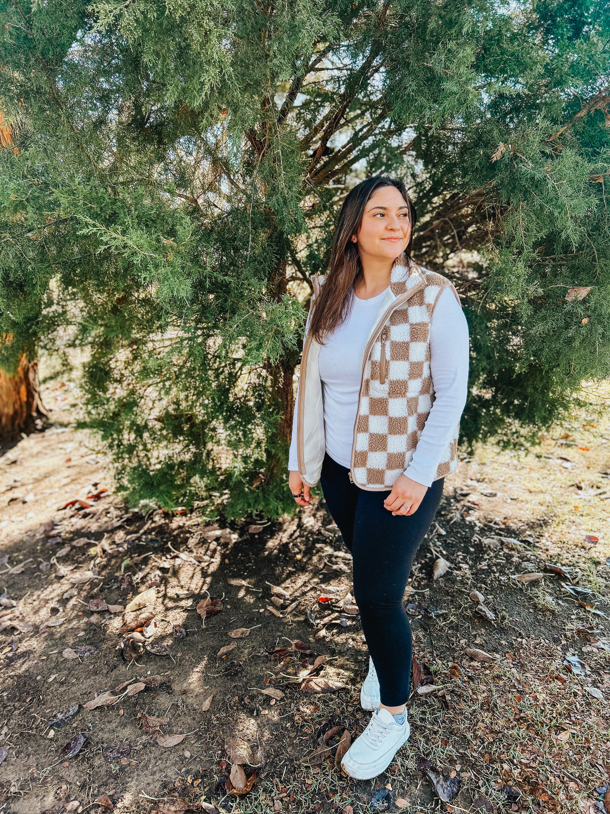 Introducing our Sherpa Checkered Vest, perfect for adding warmth and style to any outfit. Made with super comfortable sherpa material, and featuring a trendy checkered pattern, this jacket vest also includes a convenient zip pocket. Stay cozy and stylish all season long!
